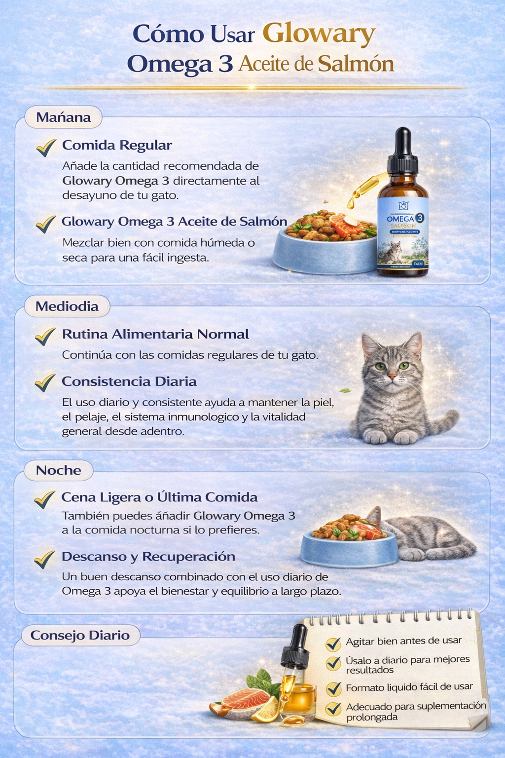 Glowary Omega 3 Aceite de Salmón aporta ácidos grasos esenciales que actúan a nivel celular, apoyando funciones vitales para que tu mascota se sienta, se vea y viva mejor cada día.